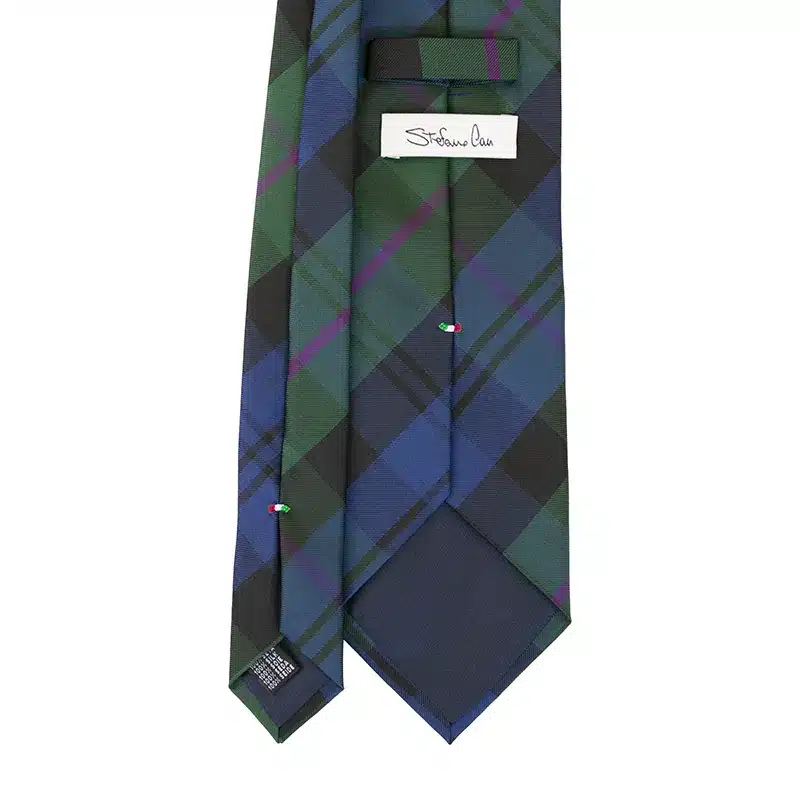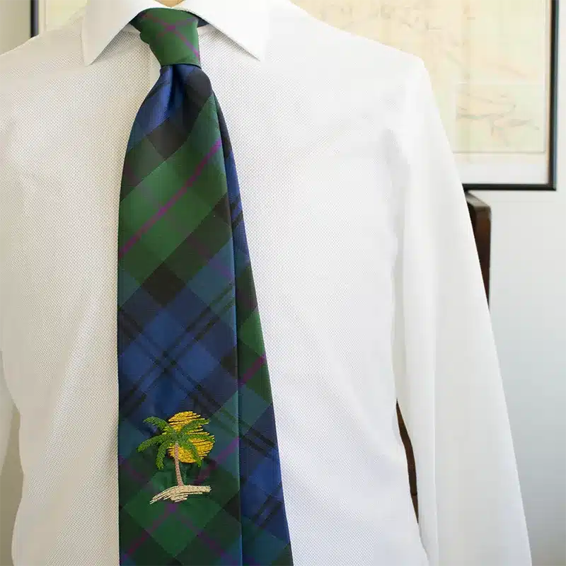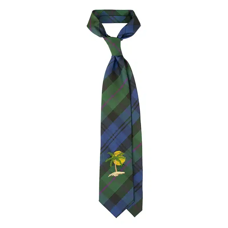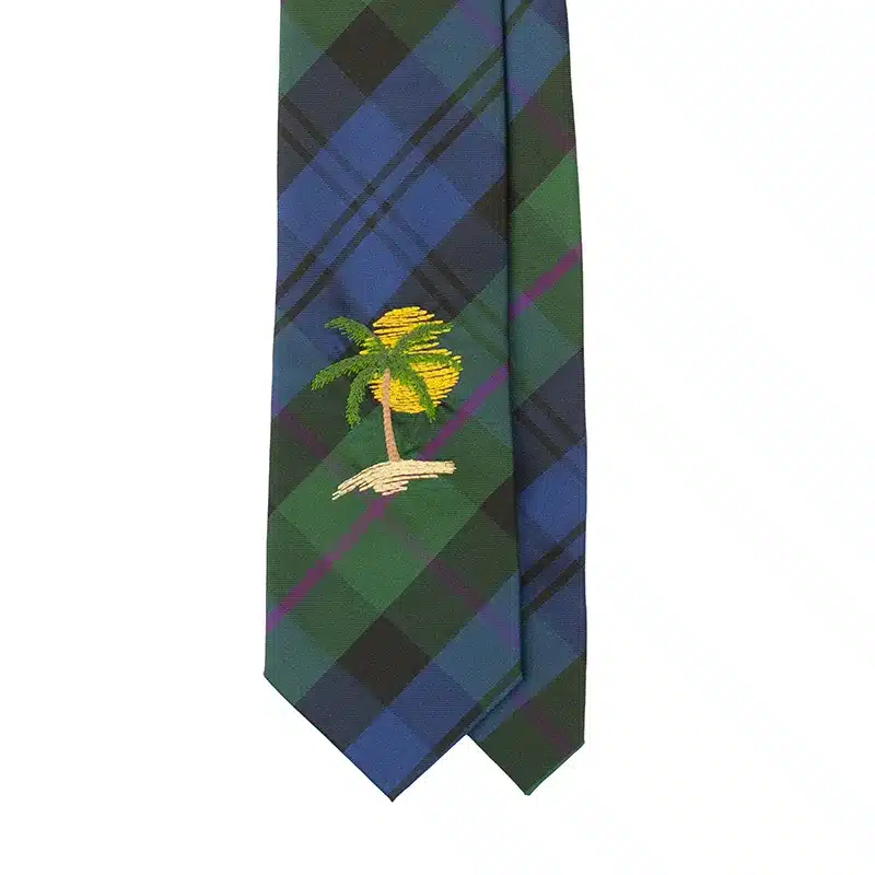 Classic British elegance with a breeze of the tropics. The British check silk tie with palm embroidery offers a refined balance between tradition and freedom of expression. The check motif, in its deep, heritage-inspired tones, meets the delicate embroidery of a palm tree, an icon of relaxation, adventure, and understated sophistication.